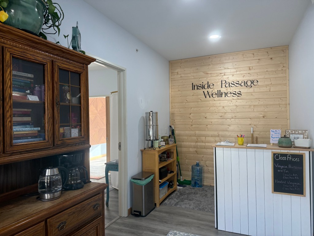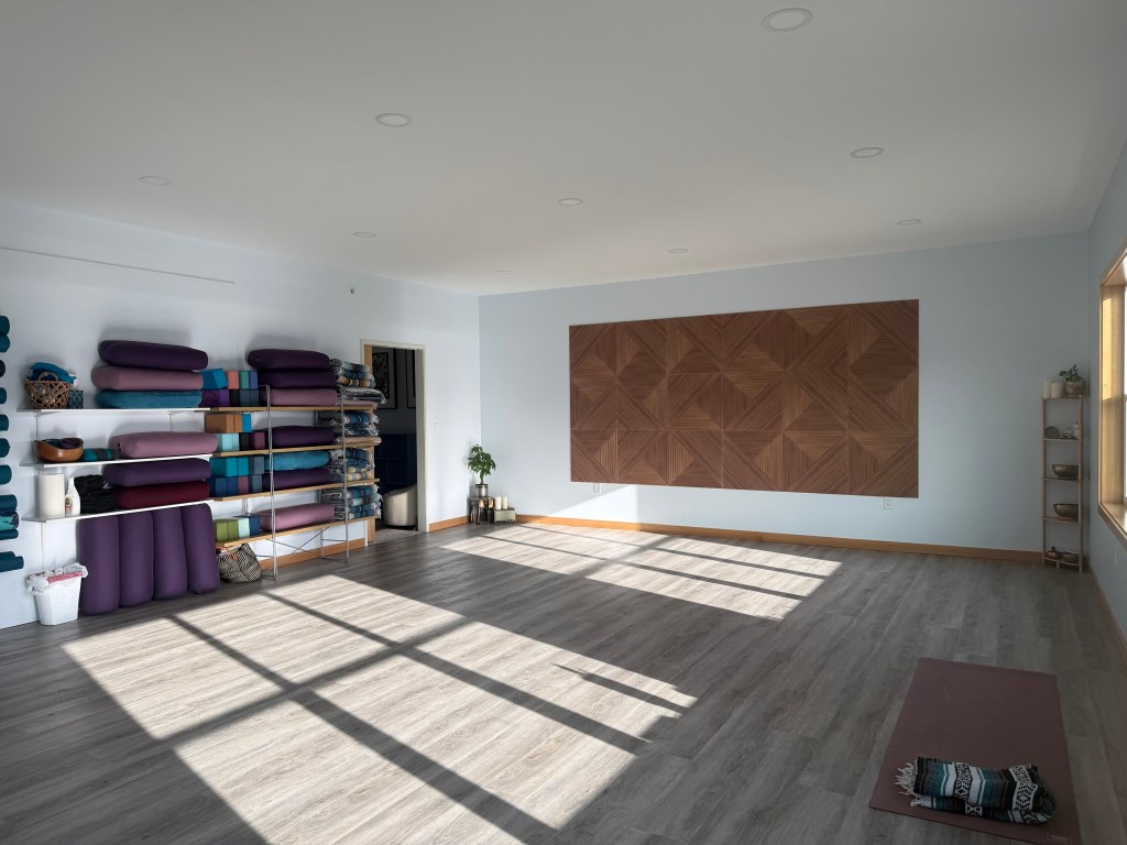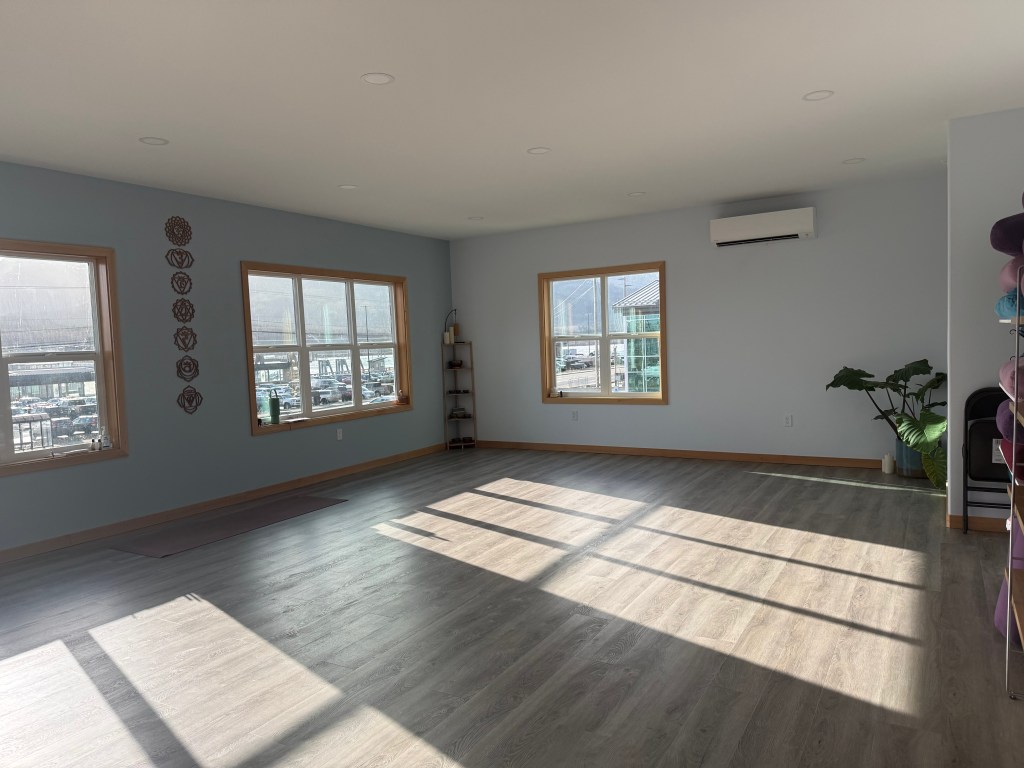 The studio has mats, blocks, bolsters, eye pillows, and blankets to borrow or you’re welcome to bring your own. With windows over looking the channel, this space welcomes warm sunshine and a view of the water.